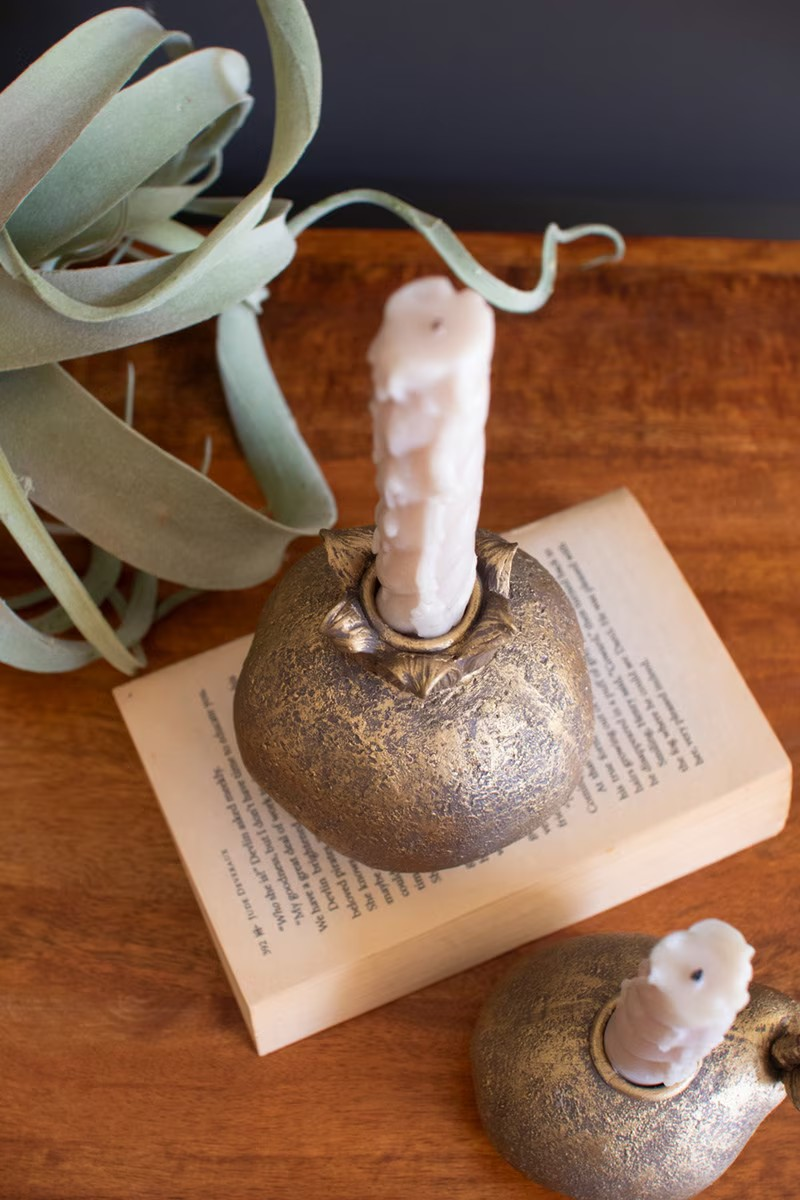 Shaped like rustic fruit, these resin taper holders add a natural, playful accent to your table. Their soft curves and weathered finish create a warm, inviting look that pairs beautifully with seasonal centerpieces. A sweet way to bring candlelight and character to your decor.
