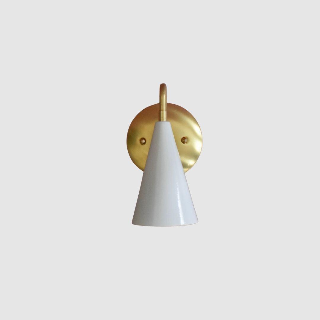 Pin up sconce with powder coated petite cone. The cone is available in any of our powder coated finishes. Shown in Cream & Natural Brass