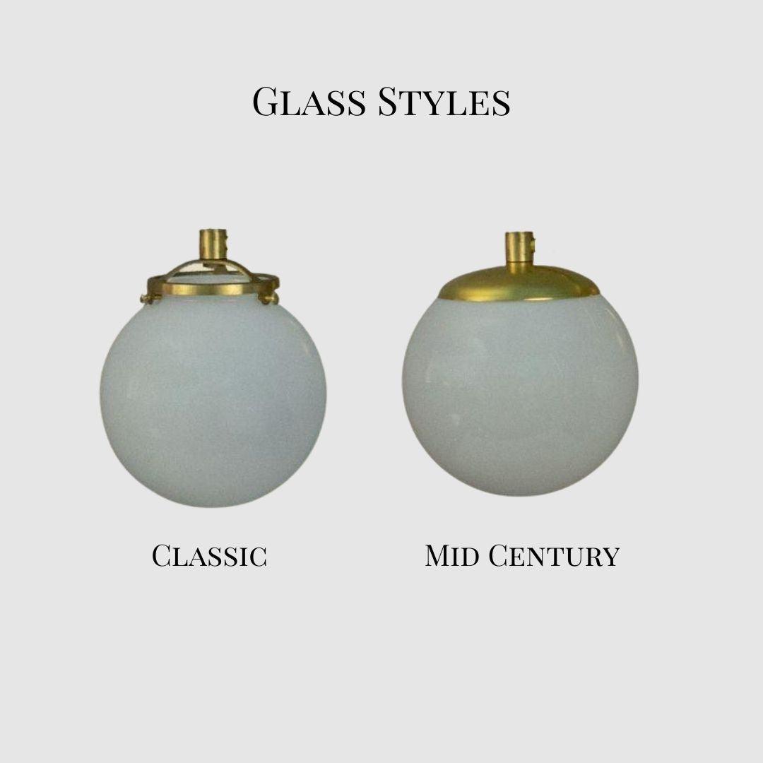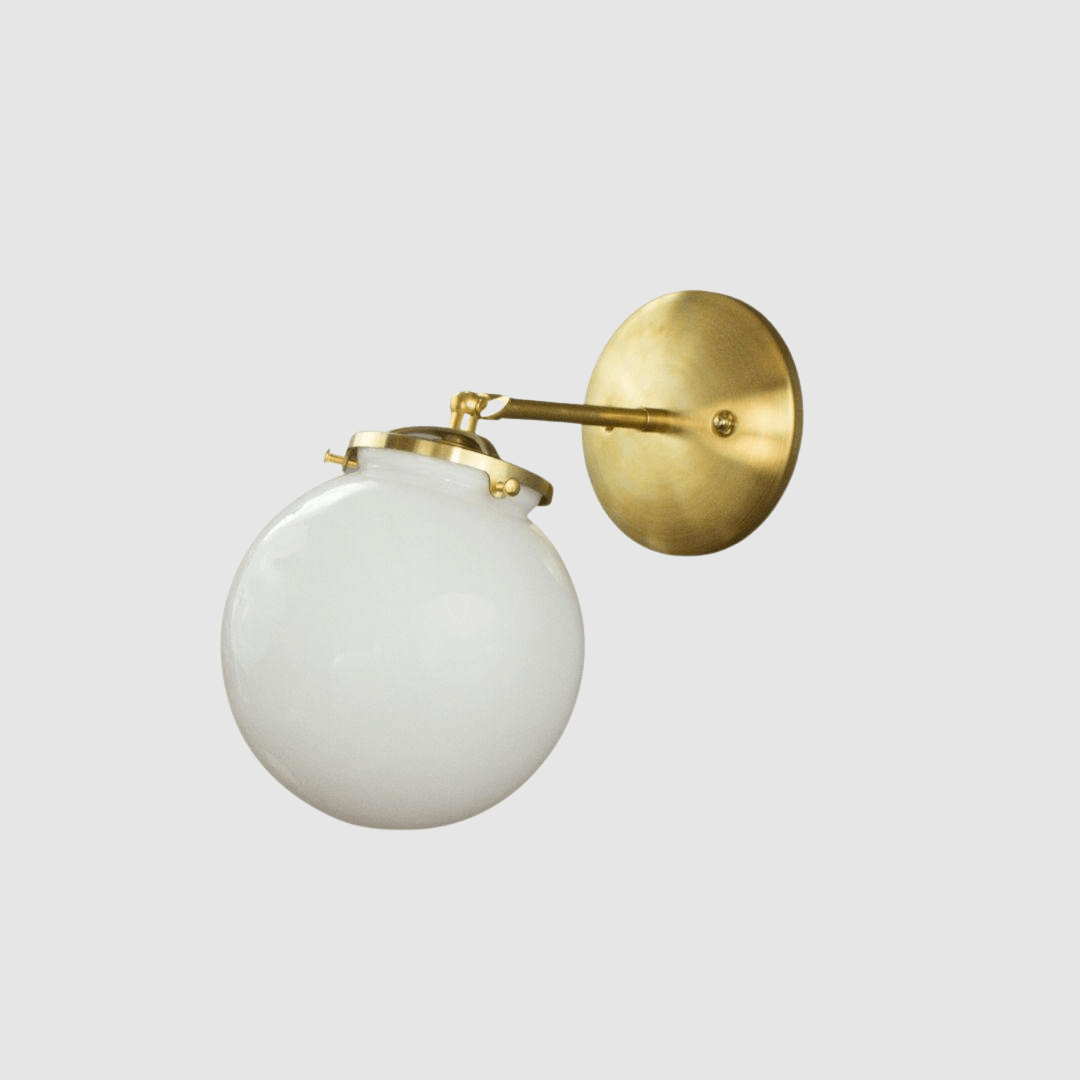Mid Century style wall sconce with your choice of finishes and glass colors. This single sconce has an adjustable head so it can range from 180 to 90 degrees. The sleek lines on this neckless glass globe are a great lighting choice for the mid century and retro lighting lover.
