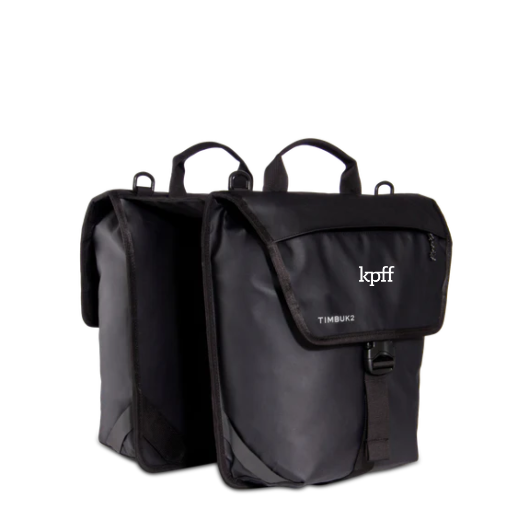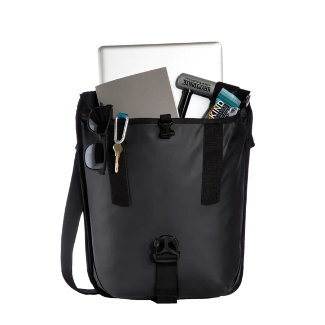 This dual pannier magically transforms into a single shoulder bag when toted off bike. Durable fabric and clever reflective hits make this a champion on and off bike. Thanks to built-in magnets, all traces of pannier-ness disappear for carting over the shoulder or by the top grab handles. An internal padded 15" laptop pocket makes every commute a beauty. Do it in a downpour. The Tandem will keep the contents of your bag dry for several hours in the rain.