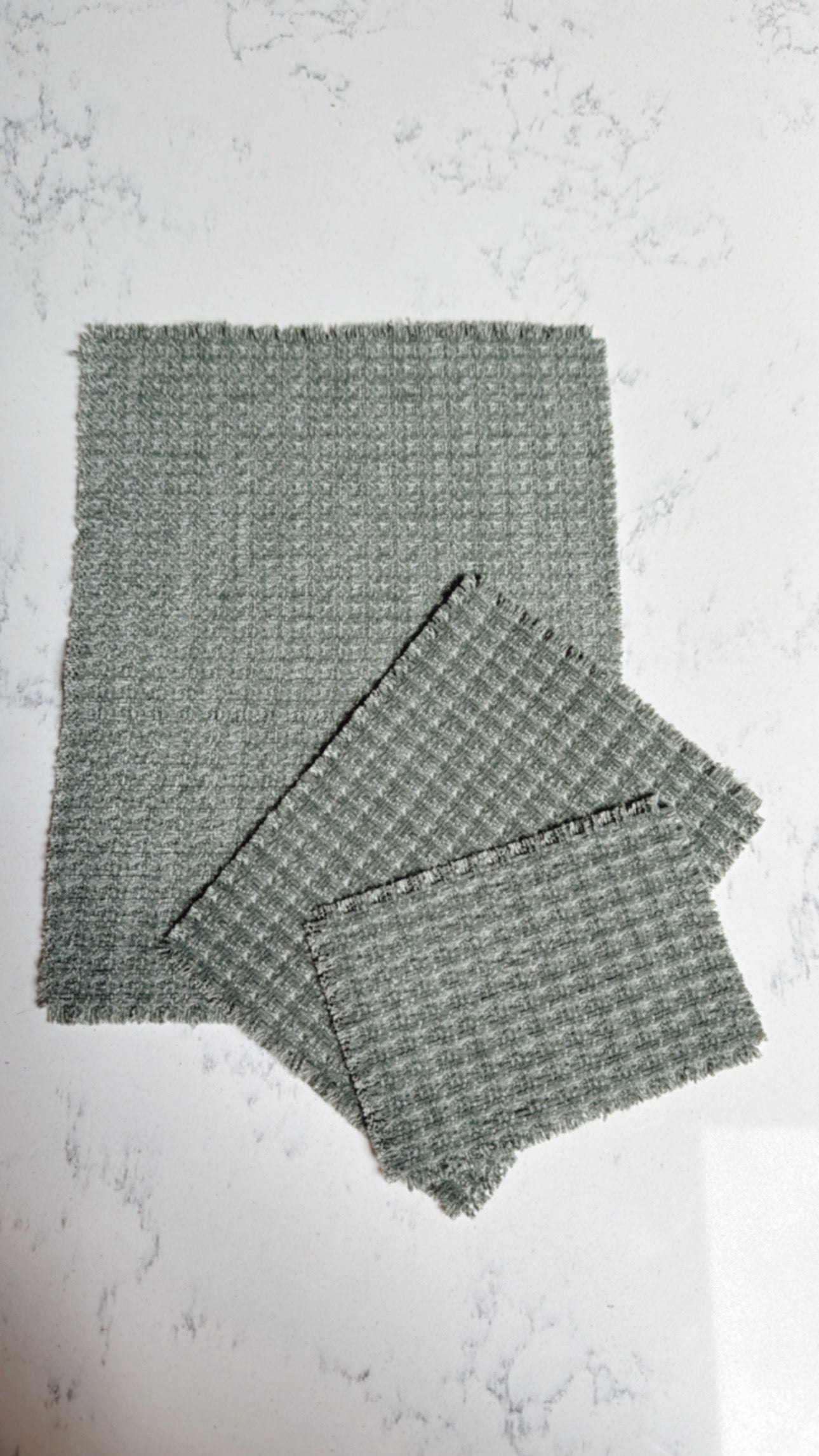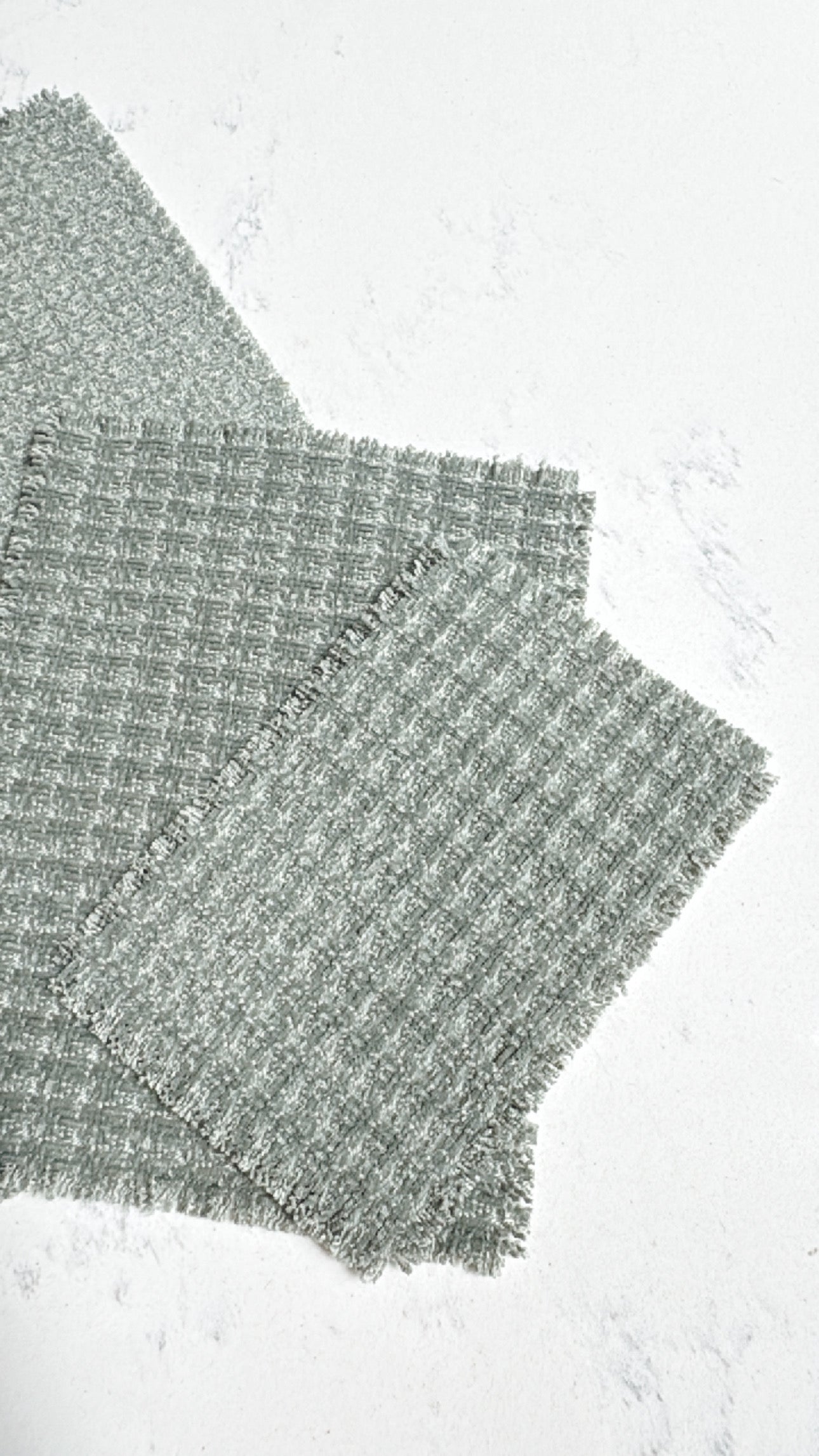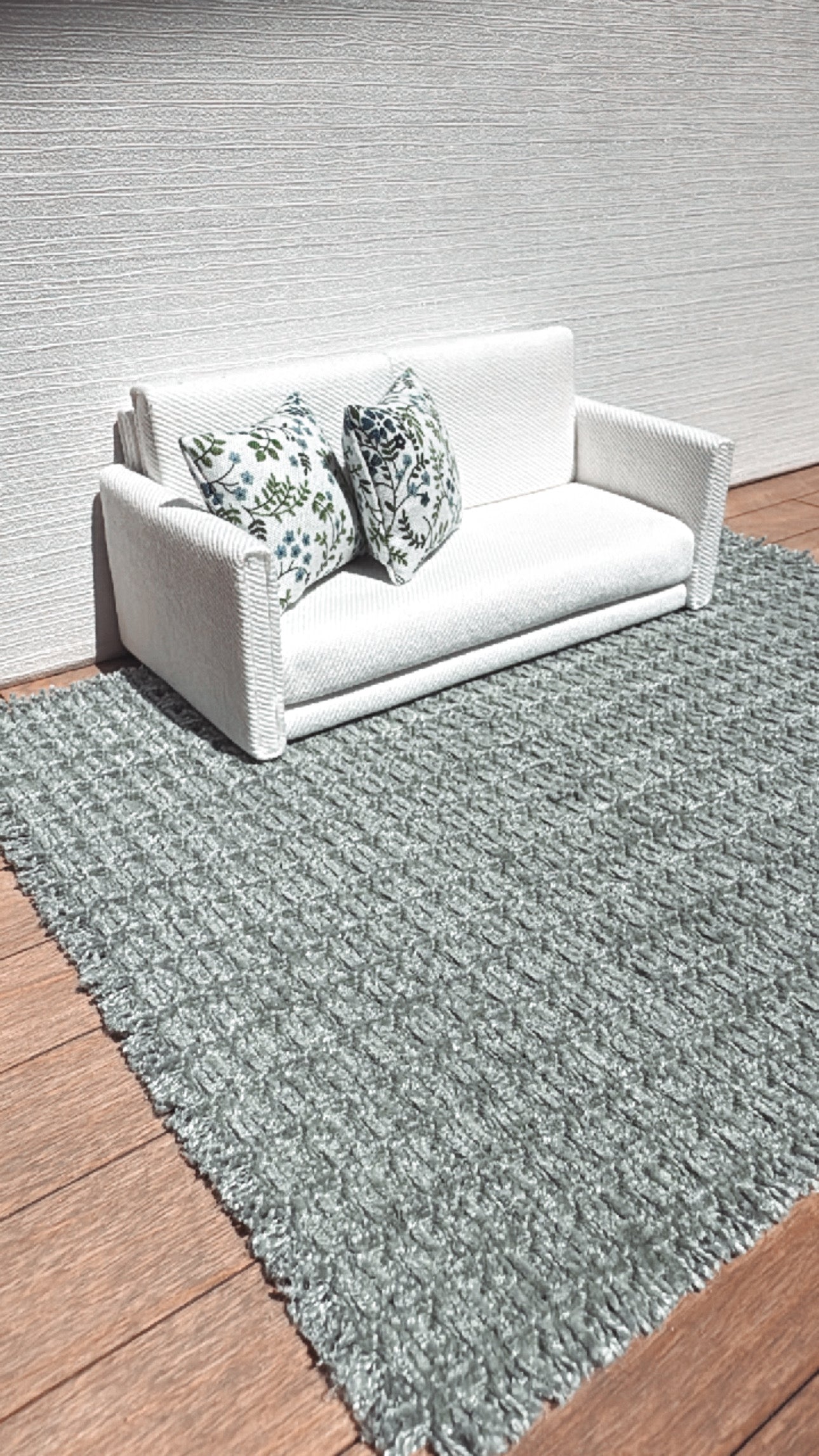 Dollhouse miniature area rug in a muted sage green woven pattern. Add some warmth and texture to your living or dining room decor with this neutral textured fabric.